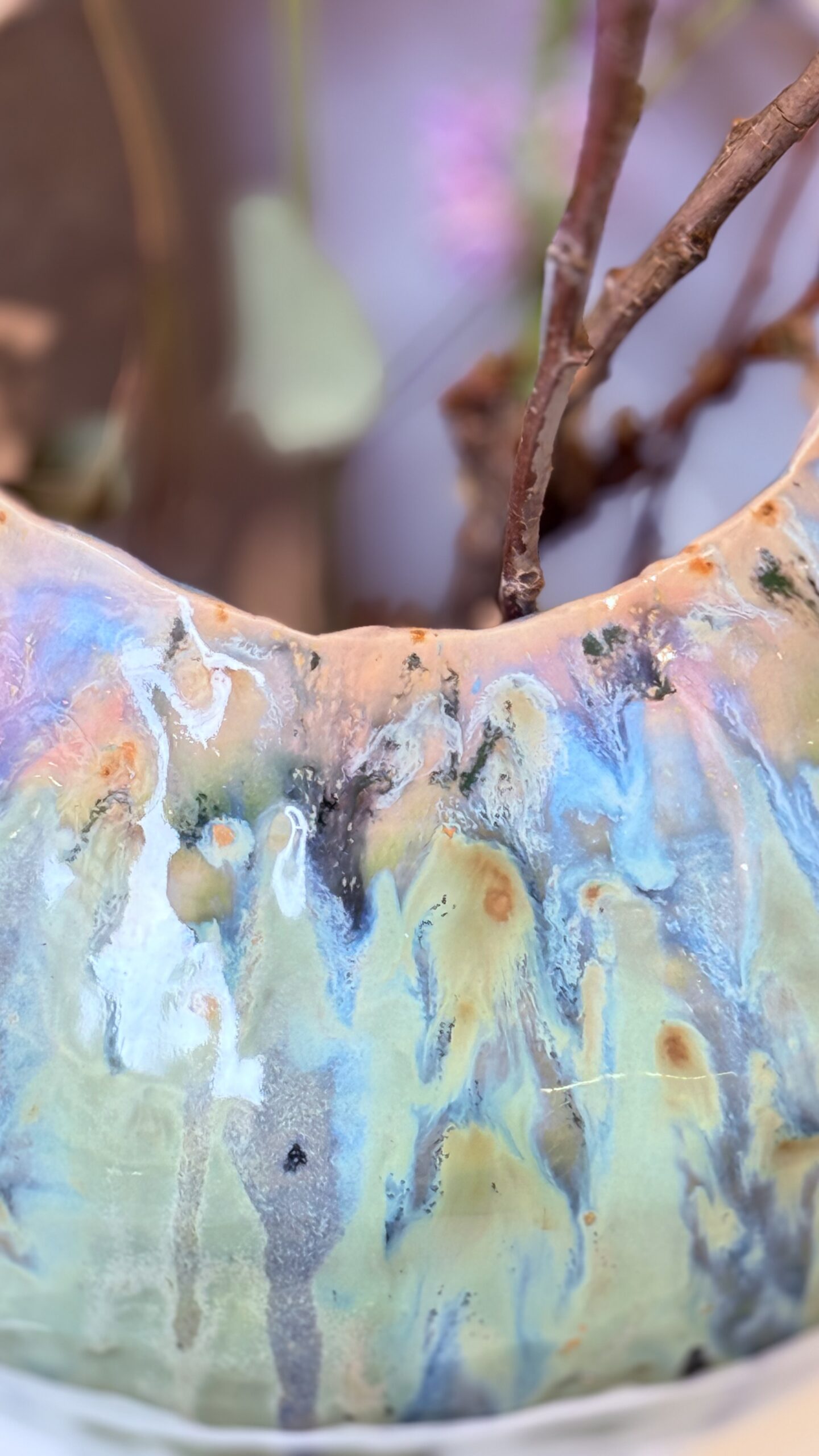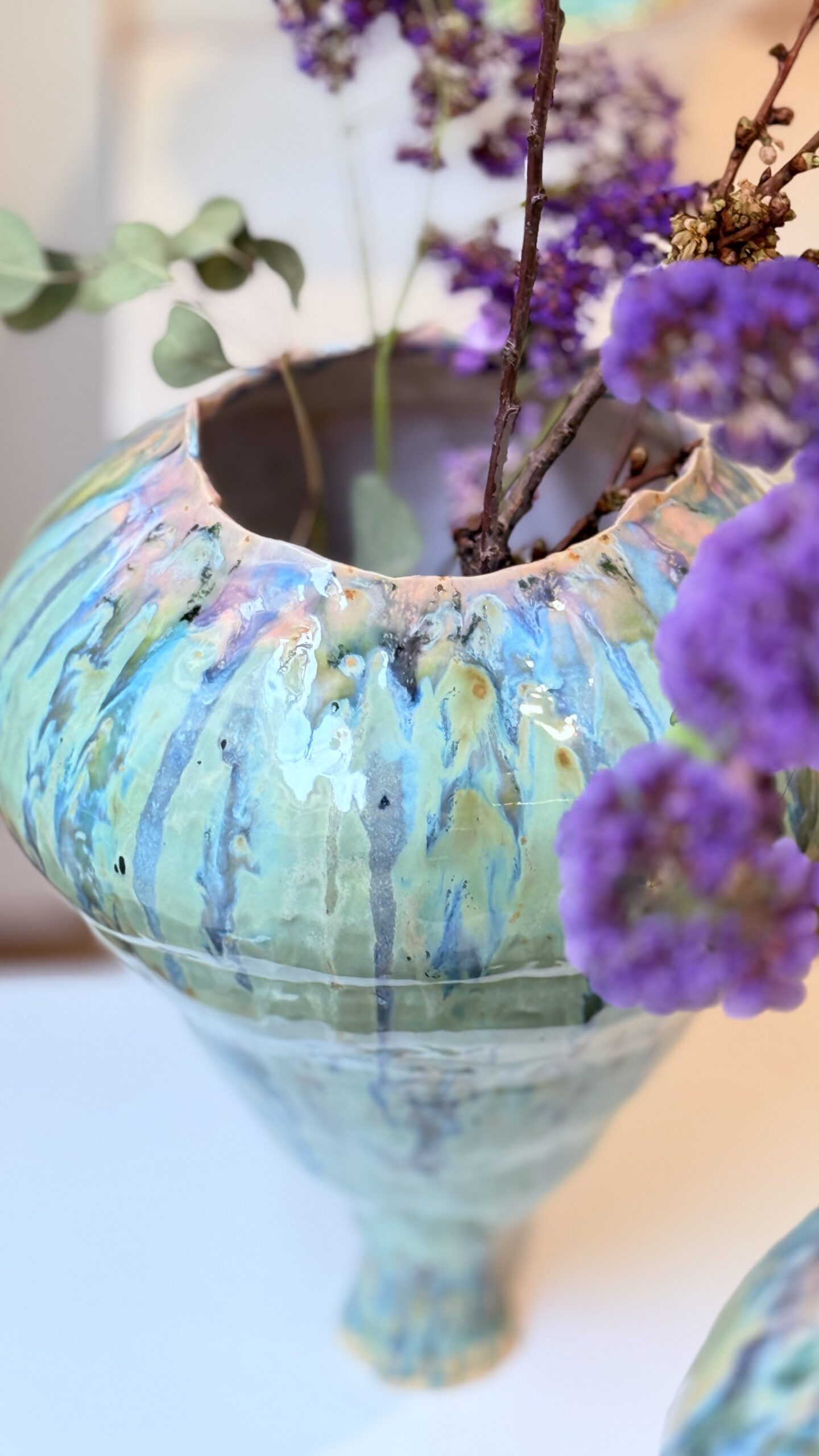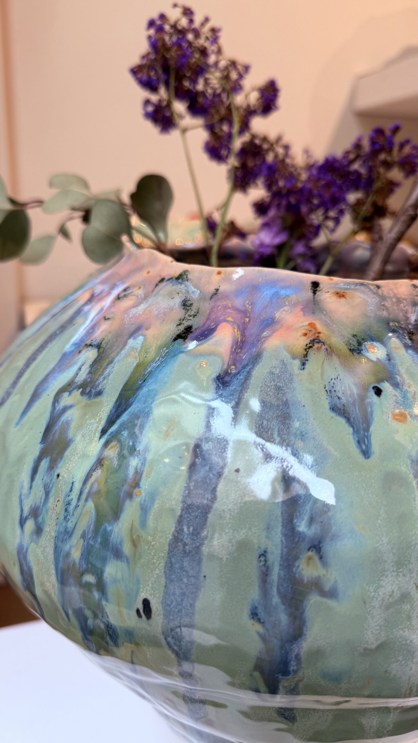 Layered glazes flow unevenly across the surface, creating subtle shifts in color and texture. These gestures act as traces of time, where presence begins to dissolve and meaning becomes unstable.