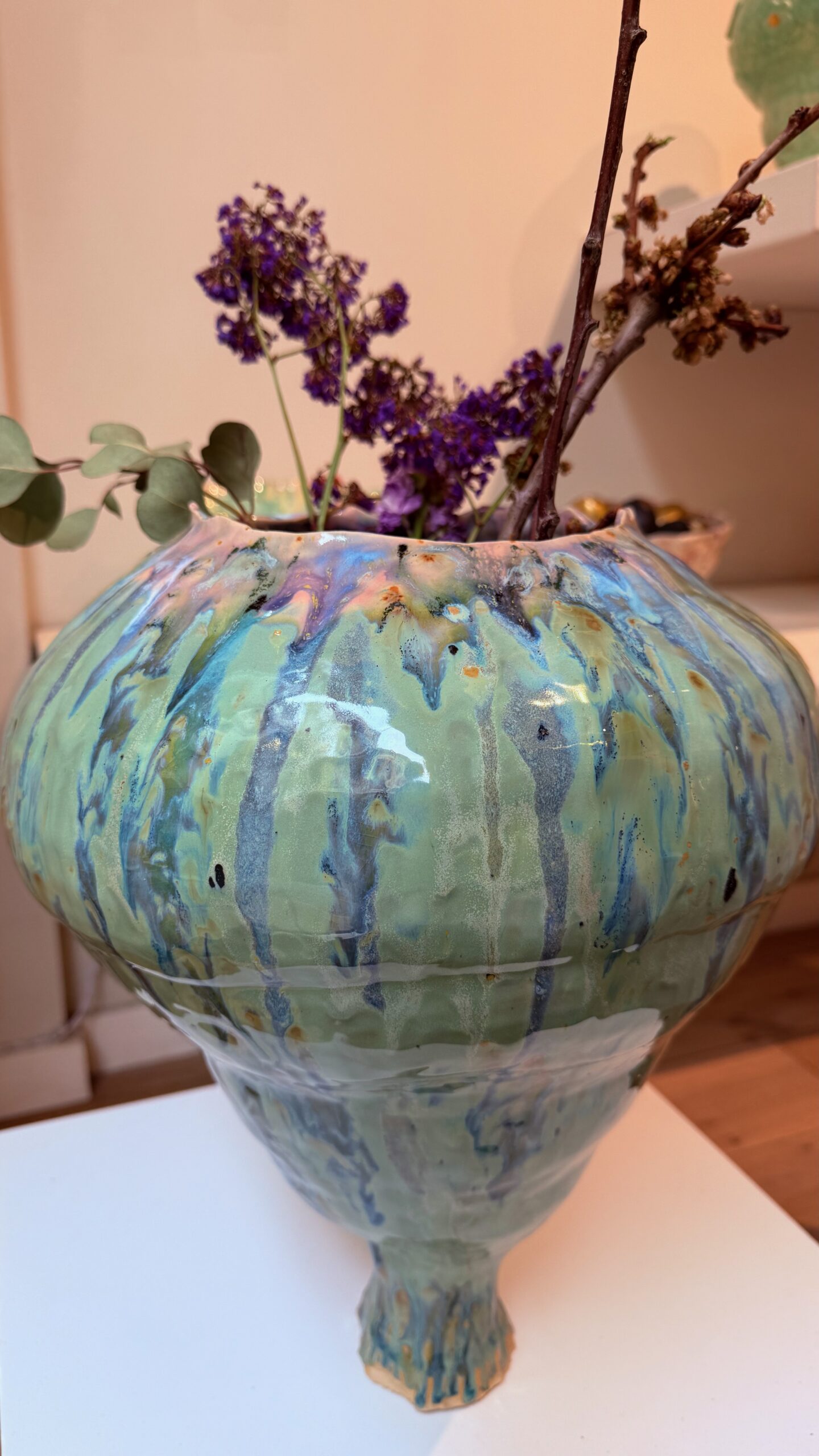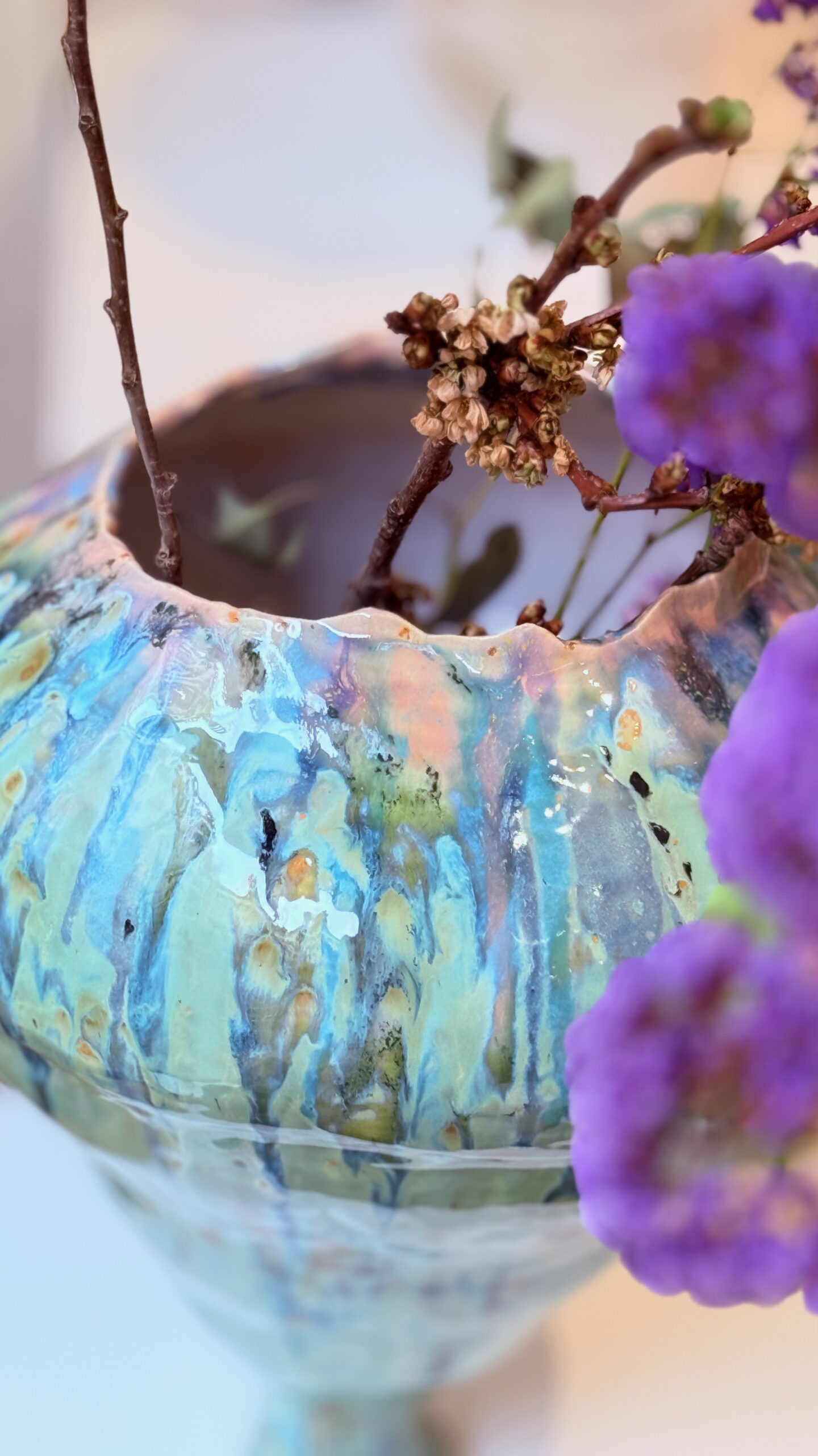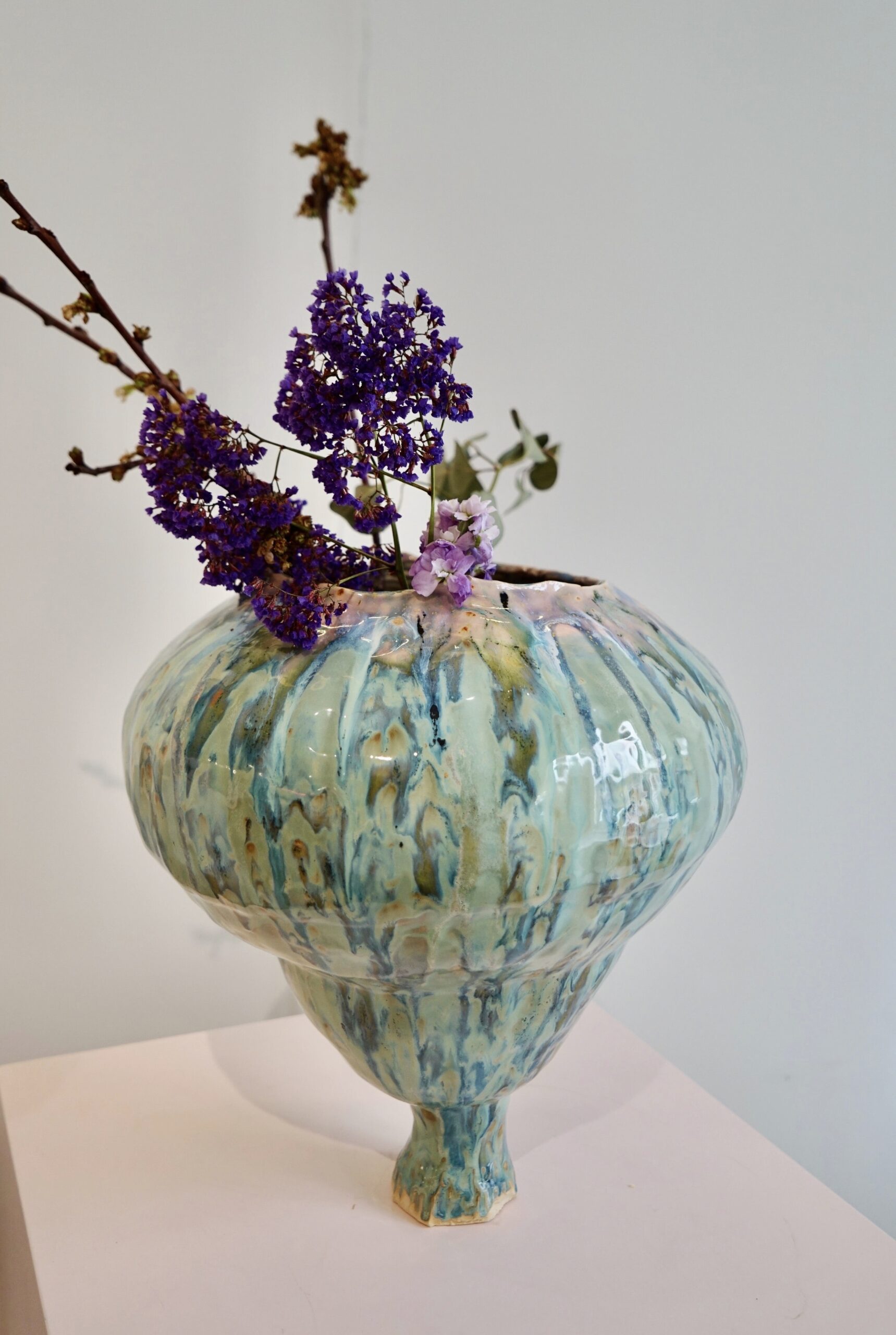 Layered glazes flow unevenly across the surface, creating subtle shifts in color and texture. These gestures act as traces of time, where presence begins to dissolve and meaning becomes unstable.